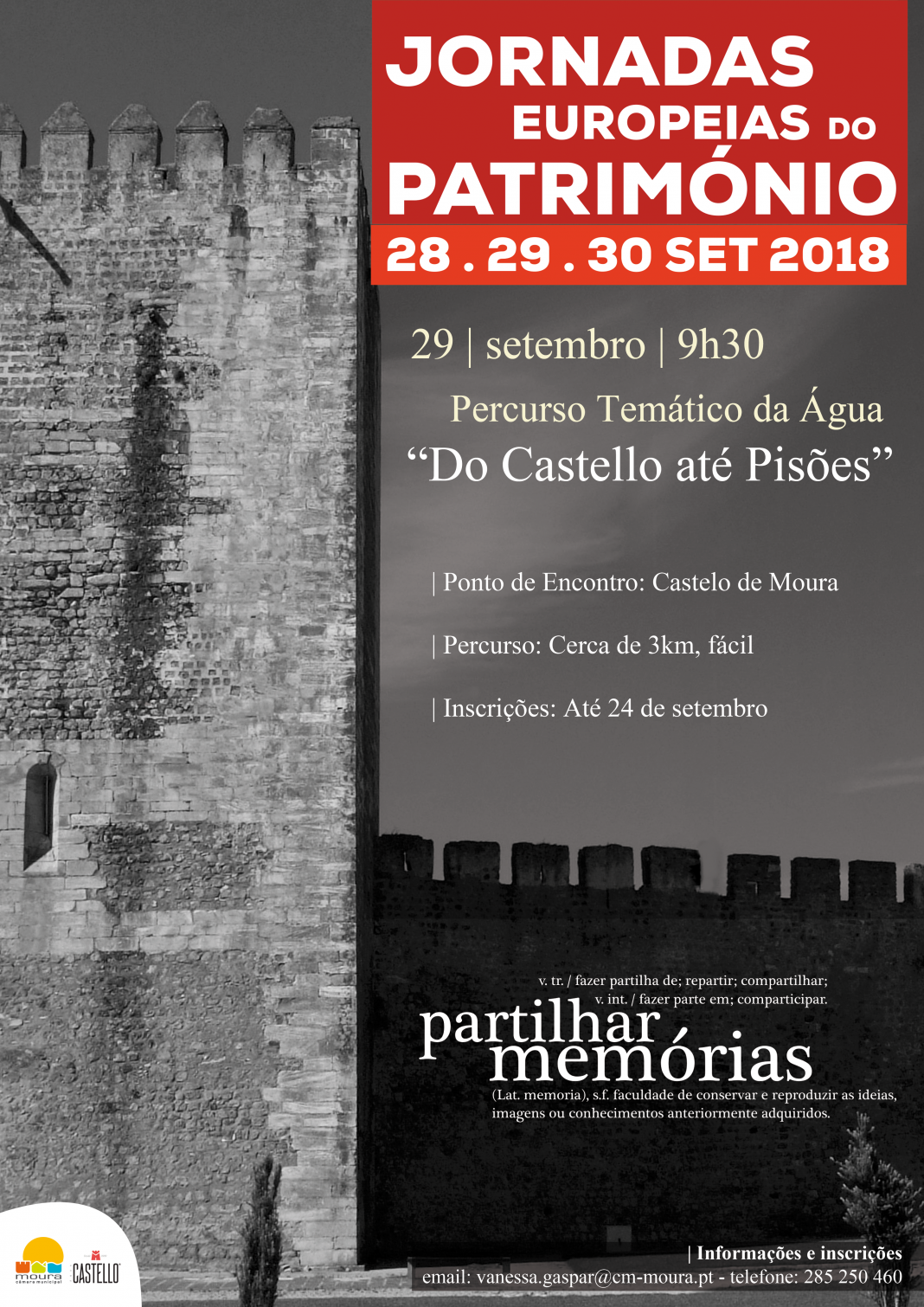 Outra das ações é o Percurso Temático da Água “Do Castello até Pisões”, uma parceria entre a Câmara Municipal de Moura e a empresa Mineraqua Portugal detentora da marca Água Castello, que acontece no próximo dia 29. Este percurso terá cerca de 3km, tem um grau de dificuldade fácil e o ponto de partida será o Castelo de Moura, local da primeira unidade de exploração desta água. A participação é gratuita, mas sujeita a inscrição que poderá ser efetuada até ao dia 24 do corrente mês, através do telefone 285 250 460 ou do e-mail vanessa.gaspar@cm-moura.pt.
