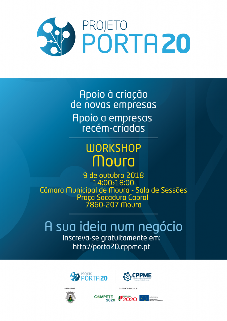 O projeto Porta20, de apoio à criação de novas empresas e apoio a empresas recém-criadas, promove um workshop em Moura no próximo dia 9 de outubro, entre as 14 e as 18 horas, na Sala de Sessões da Câmara Municipal.