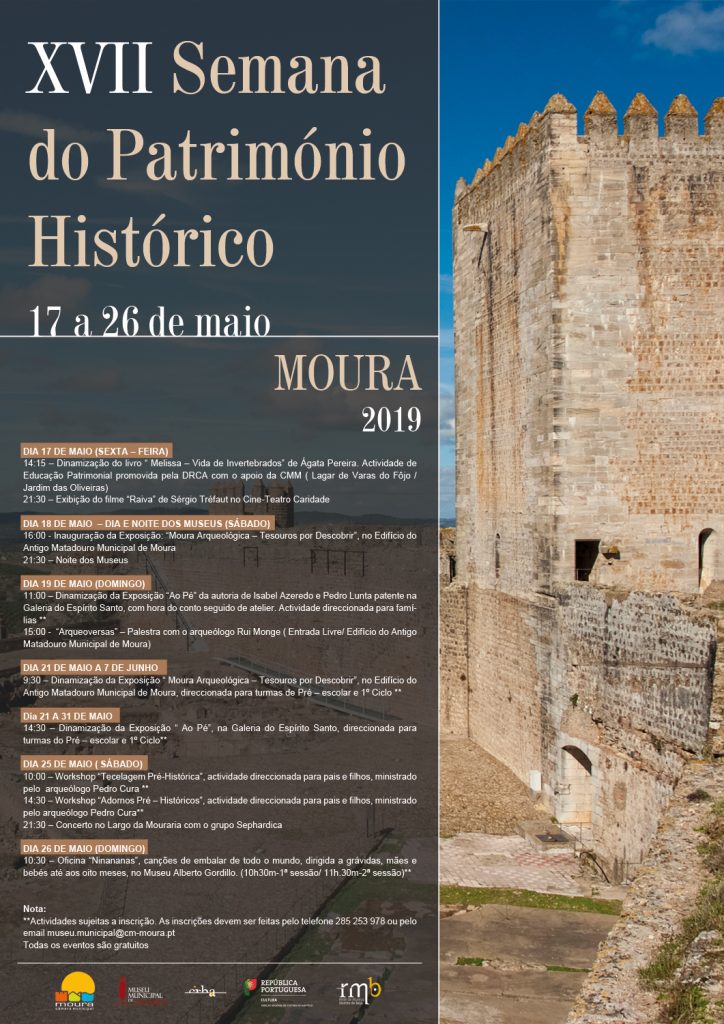 De 17 a 26 de maio Moura recebe a XVII Semana do Património Histórico. A iniciativa promovida pela Câmara Municipal de Moura pretende promover e dinamizar os diferentes núcleos museológicos e divulgar o património local, através da realização de atividades variadas, direcionadas para a comunidade escolar e para o público em geral.