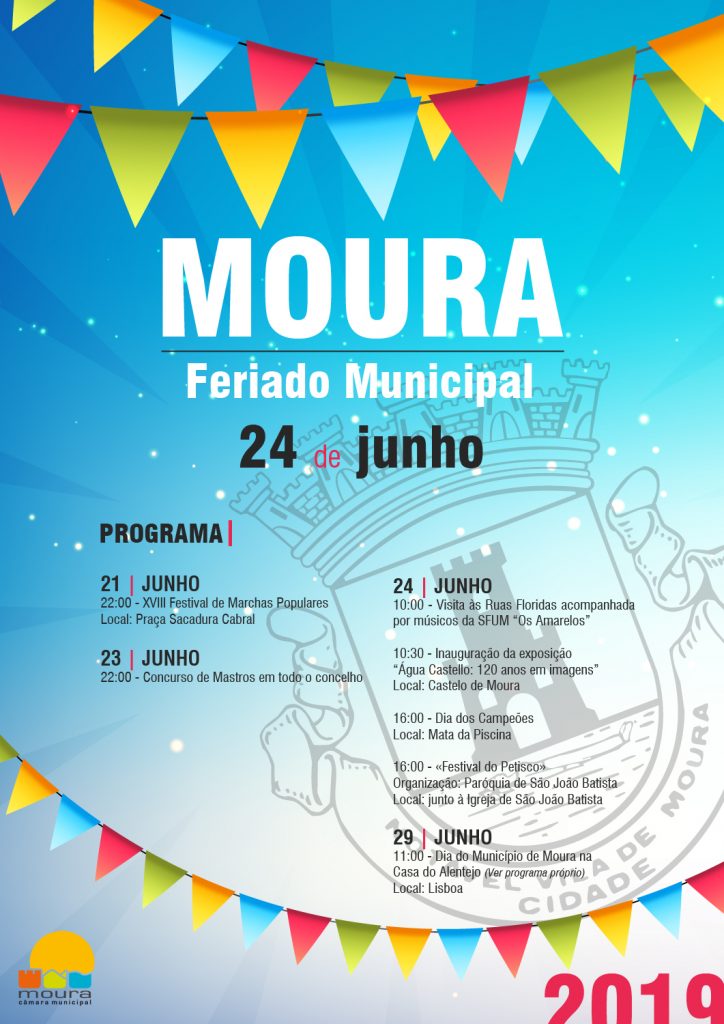 No dia 24 de junho o concelho de Moura assinala o Feriado Municipal com várias iniciativas, que decorrerão entre os dias 21 e 29 de junho.