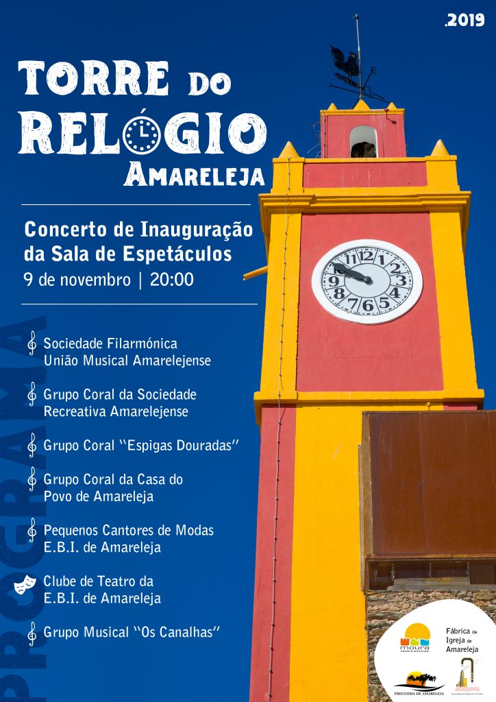 Após a conclusão dos trabalhos de requalificação do edifício da torre do relógio, de Amareleja, a Câmara Municipal de Moura juntamente com a Fábrica da Igreja de Amareleja, Junta de Freguesia de Amareleja e E.B. I. de Amareleja, irão realizar um concerto de inauguração desta nova sala de espetáculos.