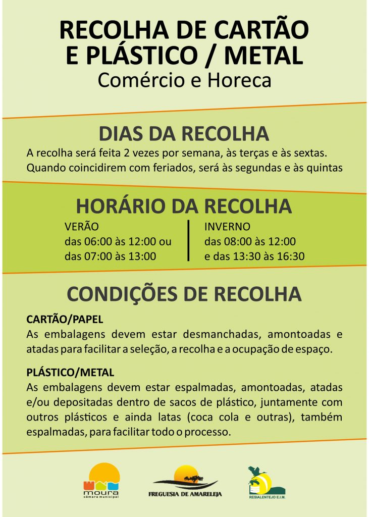 A Câmara Municipal de Moura, a Junta de Freguesia de Amareleja e a RESIALENTEJO irão promover a partir de terça-feira, 1 de setembro, uma campanha de sensibilização em Amareleja, com o intuito de dar a conhecer o serviço, destinado a estabelecimentos comerciais e ao setor Horeca, de recolha porta-a-porta de cartão, plástico e metal.