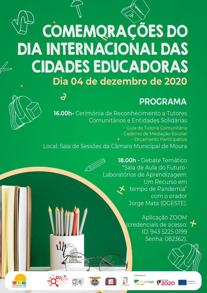 A Sala de Sessões da Câmara Municipal recebe, pelas 16:00, a cerimónia de reconhecimento a tutores comunitários e entidades solidárias, sendo na mesma ocasião apresentado o Guia de Tutoria Comunitária, o Caderno de Mediação Escolar e o Orçamento Participativo da Assembleia Infantil e do Fórum Juvenil. Pelas 18:00 decorrerá, através da plataforma Zoom, o debate online “Sala de Aula do Futuro – Laboratórios de Aprendizagem: Um Recurso em tempo de Pandemia”, com a presença do orador Jorge Mata (DGEstE). Trata-se de um debate que pretende potenciar a utilização das duas Salas de Aula do Futuro existentes no concelho, designadamente em Moura e Amareleja.