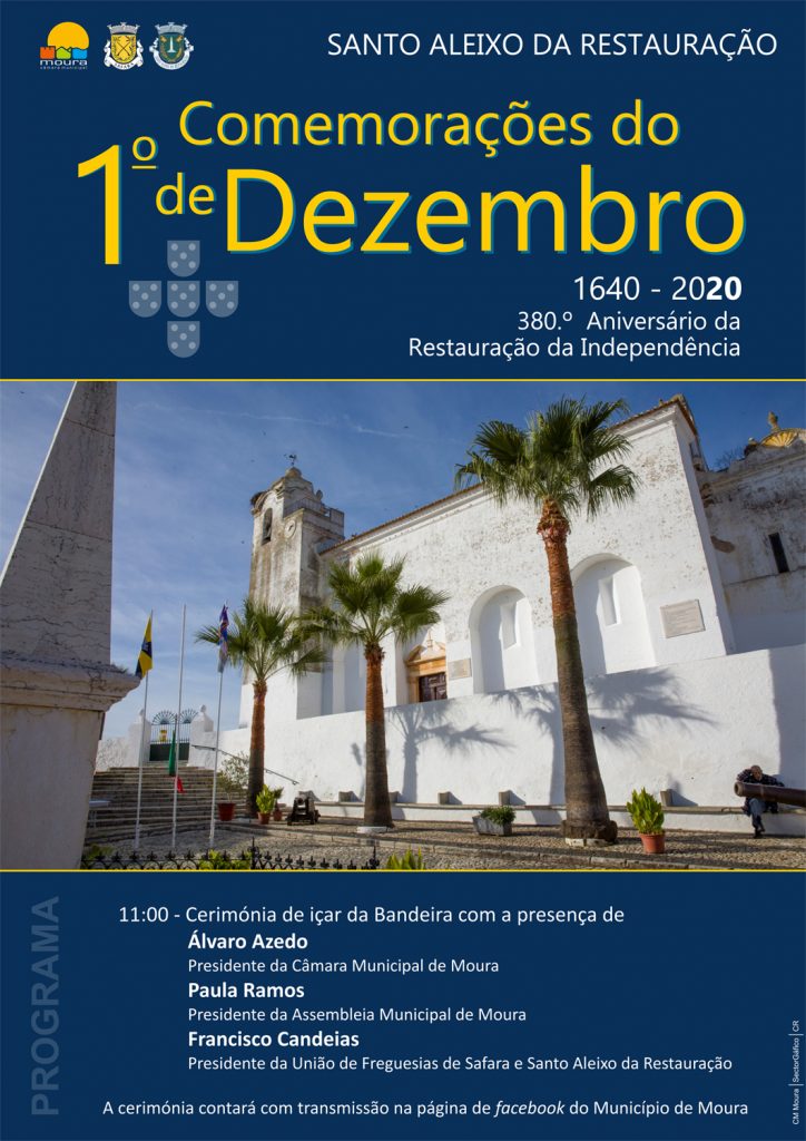 O programa do 1.º de Dezembro será assinalado com o Içar da Bandeira, às 11:00, com as presenças de Álvaro Azedo, Presidente da Câmara Municipal de Moura, de Paula Ramos, Presidente da Assembleia Municipal de Moura, e de Francisco Candeias, Presidente da União de Freguesias de Safara e Santo Aleixo da Restauração.