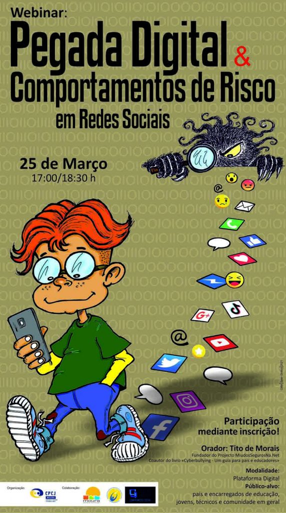 A CPCJ de Moura dinamiza dia 25 de março, às 17:00, o Webinar “Pegada Digital & Comportamentos de risco nas redes sociais”, cujo orador é Tito de Morais, fundador da página de internet “Miúdos Seguros na Net”, com provas dadas na área em apreço, e um currículo invejável, proporcionar-nos-á um momento de reflexão, partilha e descoberta que vão permitir melhorar as competências digitais dos participantes.