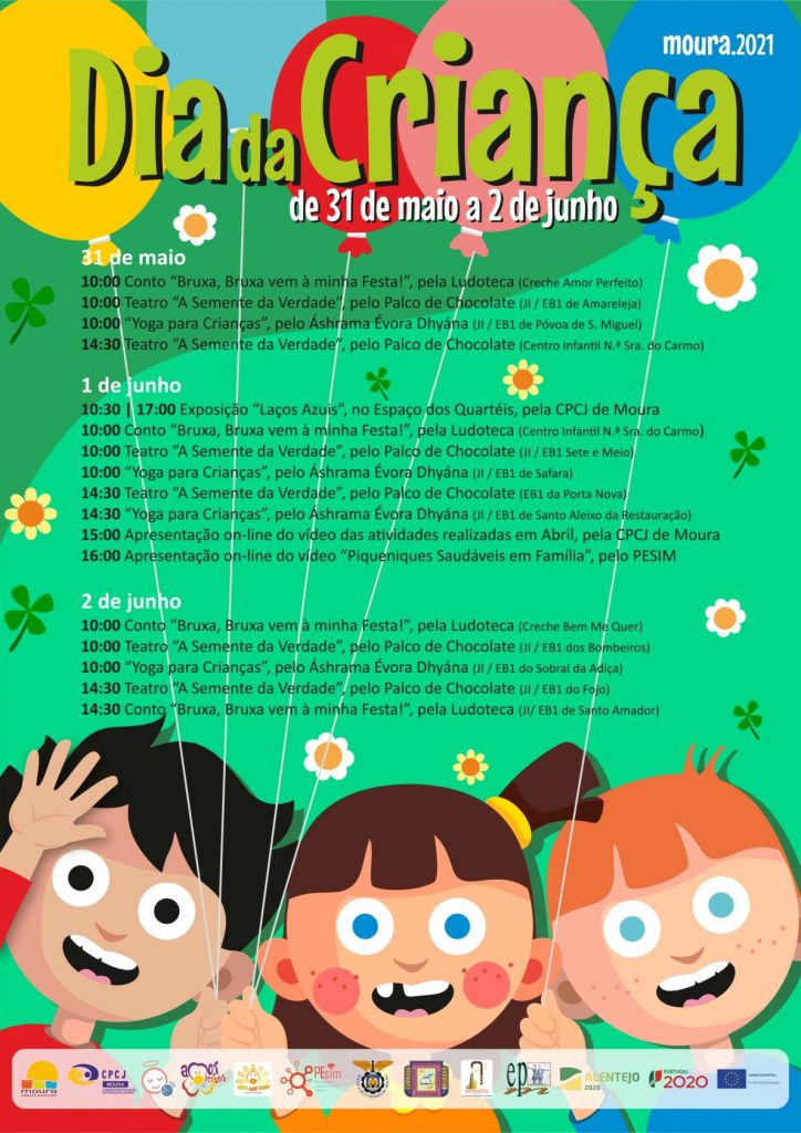 No dia 1 de junho, Dia Mundial da Criança, destaque ainda para a Exposição “Laços Azuis”, que estará patente entre as 10:30 e as 17:00, no espaço exterior dos Quartéis, pela CPCJ de Moura, e a mesma entidade apresenta, às 15:00, on-line, o vídeo das atividades realizadas em abril. Já às 16:00, o PESIM, apresenta, on-line, o vídeo “Piquenique saudáveis em família”.