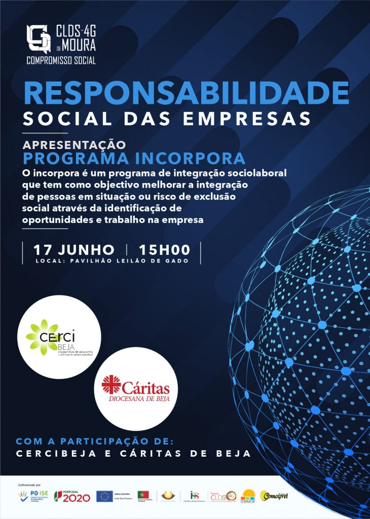 O Moura – Compromisso Social CLDS4-G, a Câmara Municipal de Moura e o Programa Incorpora, da Fundação “La Caixa”, vão apresentar, no dia 17 de junho, a sessão de esclarecimento “A Responsabilidade Social das empresas – Programa Incorpora da Fundação “La Caixa”, destinada a empresas locais e outras entidades.