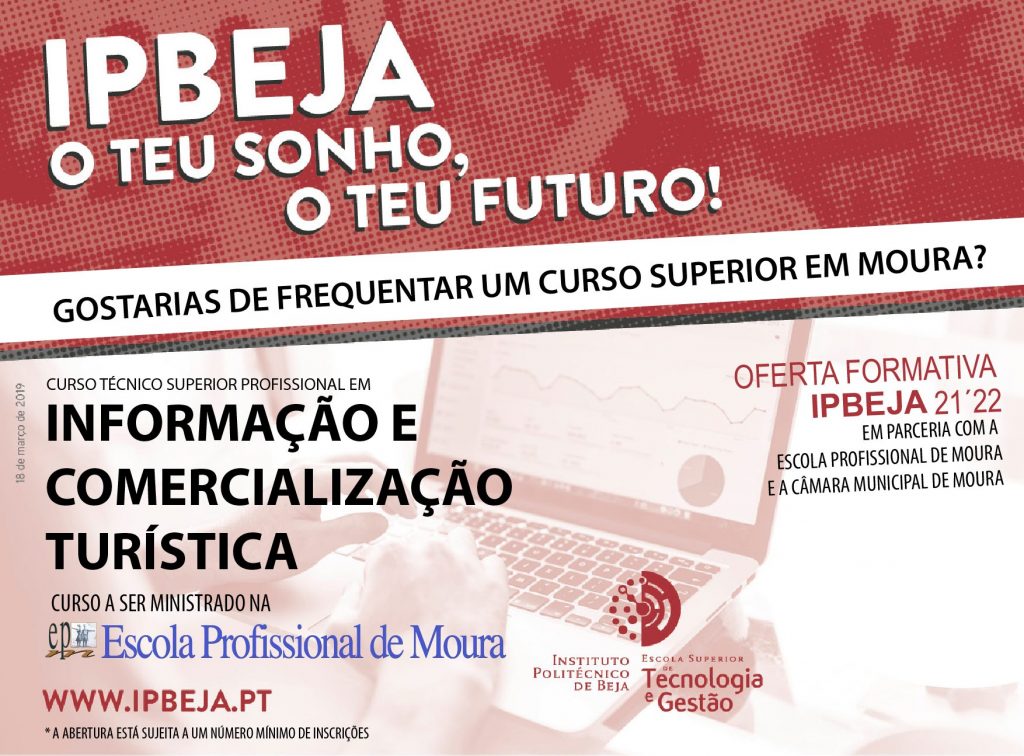 Encontram-se abertas as inscrições para o Curso Técnico Superior Profissional (CtesP), na área do turismo, a ser ministrado na Escola Profissional de Moura, em parceria com o Instituto Politécnico de Beja e com a Câmara Municipal de Moura.