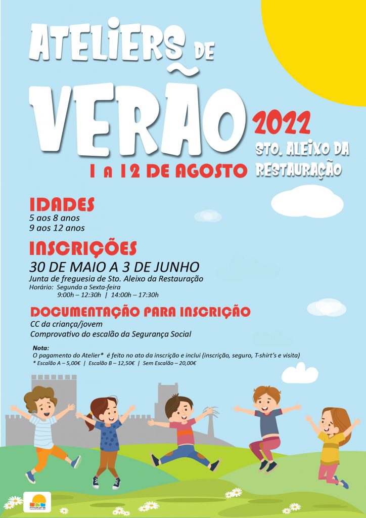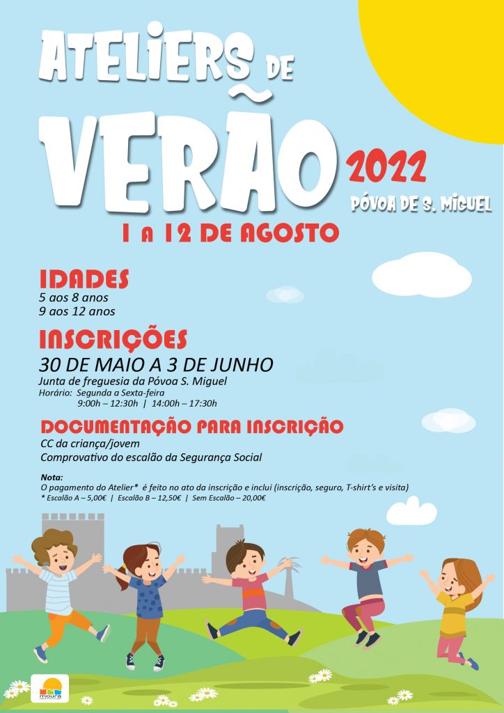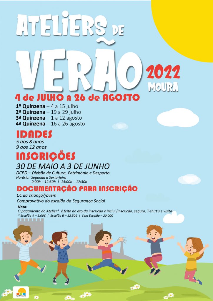 Os Ateliers de Verão da Câmara Municipal de Moura destinam-se a crianças dos 5 aos 8 anos e a jovens dos 9 aos 12 anos. As inscrições poderão ser efetuadas entre 30 de maio e 3 de junho na Câmara Municipal de Moura (Divisão de Cultura, Património e Desporto), no Polo da Biblioteca de Amareleja, no Polo da Biblioteca de Santo Amador, na Junta de Freguesia de Póvoa de São Miguel e na Junta de Freguesia de Santo Aleixo da Restauração.