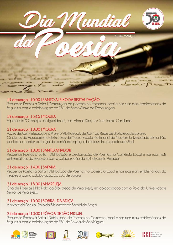 No dia 21 de março, durante a manhã, junto do Pelourinho, em Moura, os alunos do Agrupamento de Escolas de Moura, da Escola Profissional e da Universidade Sénior, irão cantar e declamar os poetas de Abril, uma iniciativa integrada no projeto “Abril depois de Abril”, da Rede de Bibliotecas Escolares. No mesmo dia, às 10:00, em Sobral da Adiça, realiza-se a “Árvore da Poesia”, no Polo da Biblioteca. Às 15:00, em Amareleja, no Polo da Biblioteca, em colaboração com o polo de Amareleja da Universidade Sénior, haverá um “Chá de Poemas”.