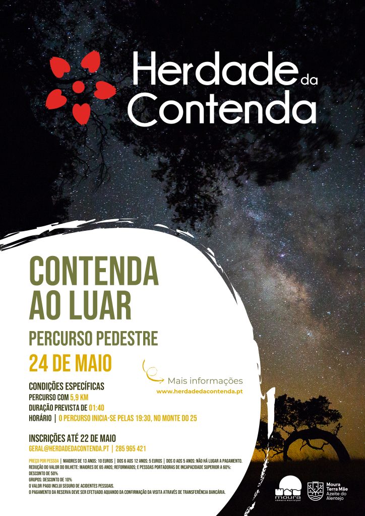 O percurso “Contenda ao Luar” conta com uma distância de 5,9 km e uma duração prevista de 1h:40m. Para participar deve realizar a sua inscrição através do correio eletrónico geral@herdadedacontenda.pt ou do telefone 285 965 421. A inscrição poderá ser realizada até ao dia 22 de maio.