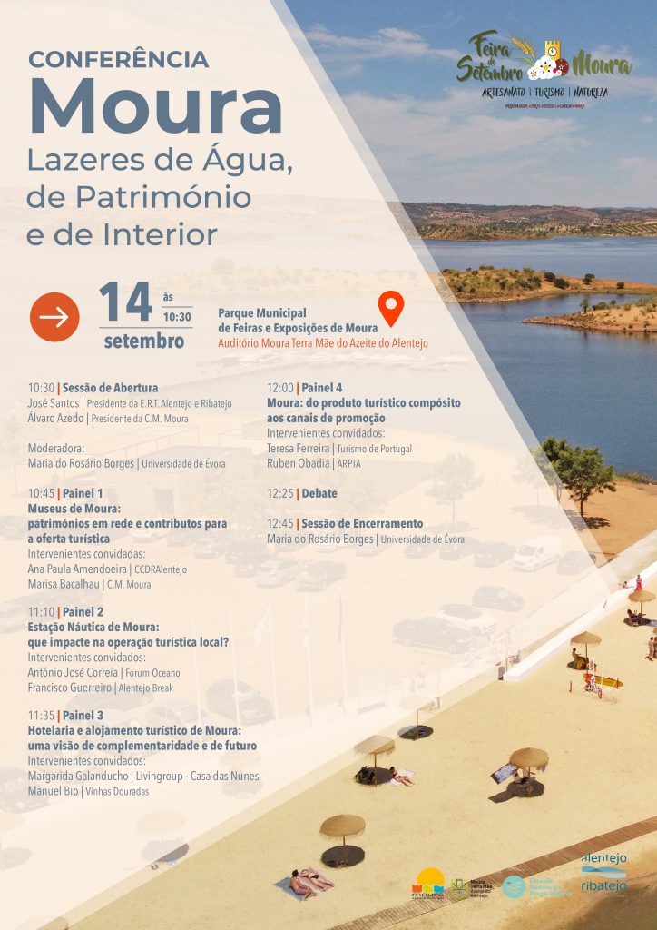 A conferência contará com 4 painéis dedicados às temáticas “Museus de Moura: património em rede e contributos para a oferta turística”, “Estação Náutica de Moura: que impacte na operação turística local?”, “Hotelaria e alojamento turístico de Moura: uma visão de complementaridade e de futuro” e “Moura: do produto turístico compósito aos canais de promoção”.