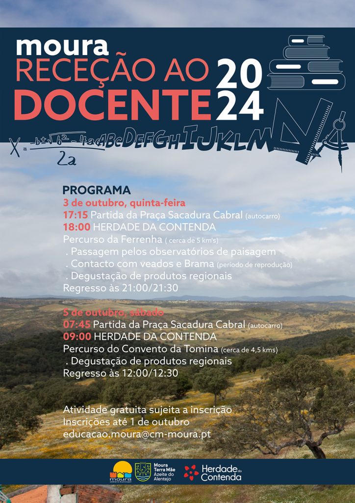 Este ano, a “Receção ao Docente” decorrerá ao longo de dois dias e terá lugar na Herdade da Contenda. No dia 3 de outubro, quinta-feira, os participantes partirão da Praça Sacadura Cabral, às 17:15, rumo à Herdade da Contenda, onde realizarão o Percurso da Ferrenha, com passagem pelos observatórios de paisagem, observação de veados em época reprodutora (Brama), além de uma degustação de produtos regionais.