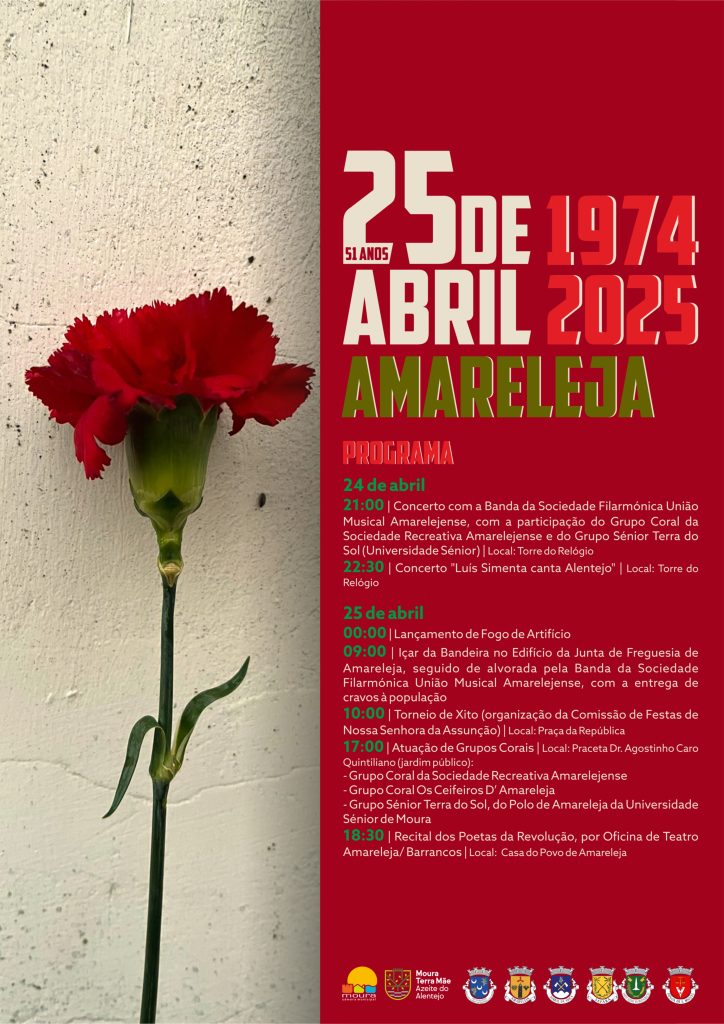 A Câmara Municipal de Moura convida toda a população a participar destas iniciativas que assinalam os 51 anos do 25 de Abril.