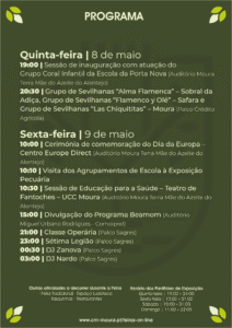 Na sexta-feira, 9 de maio, é de destacar do programa a cerimónia de comemoração do Dia da Europa, às 10:00, no Auditório Moura Terra Mãe do Azeite do Alentejo; às 15:00, no Auditório Miguel Urbano Rodrigues (Comoiprel), a divulgação do programa BeaMom. À noite, a animação musical, no Palco Sagres, tem início às 21:00, com a atuação do grupo Classe Operária e, às 23:00, sobe ao palco o grupo Sétima Legião. A noite fecha ao som dos DJ’s Zanova e Nardo.