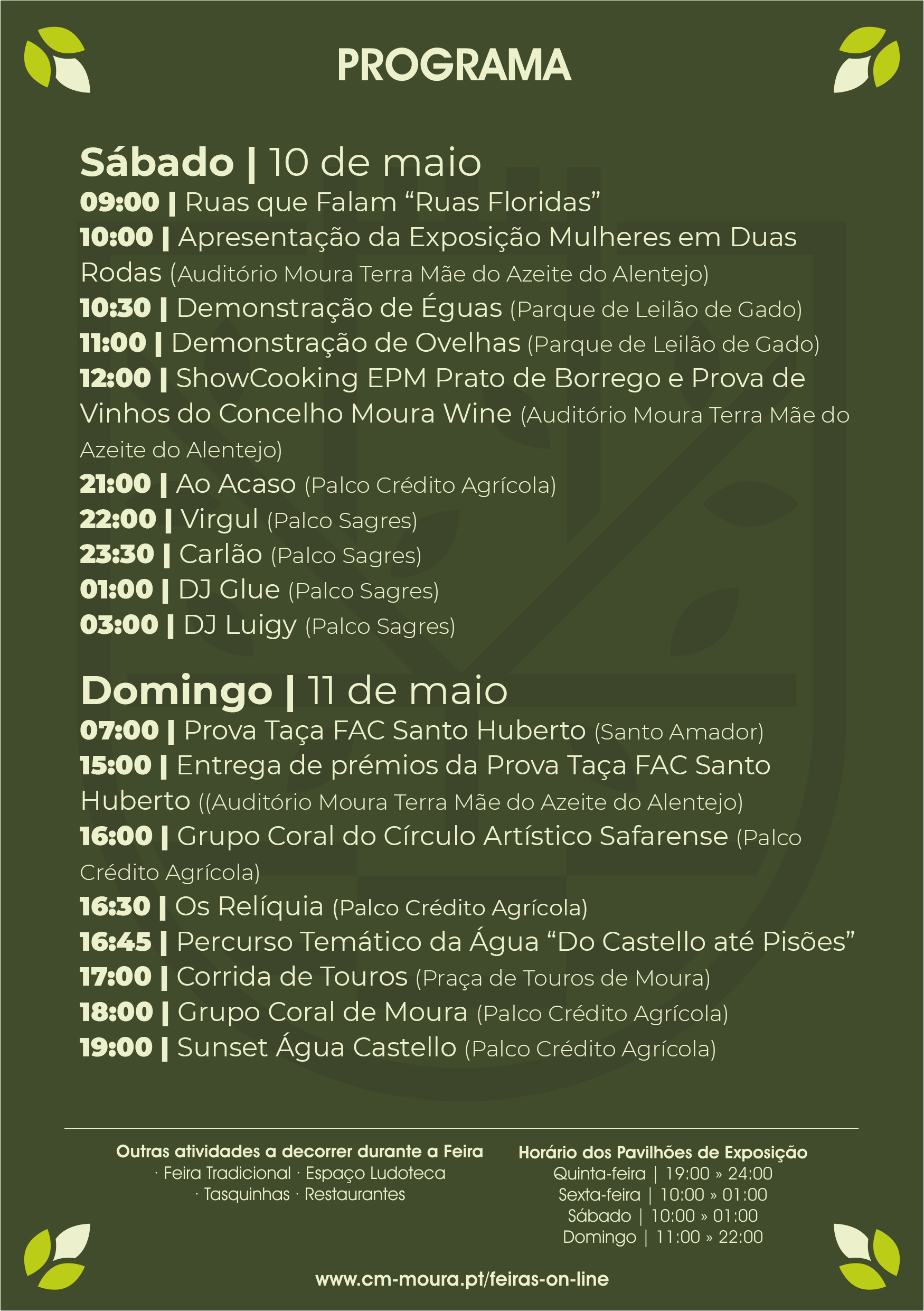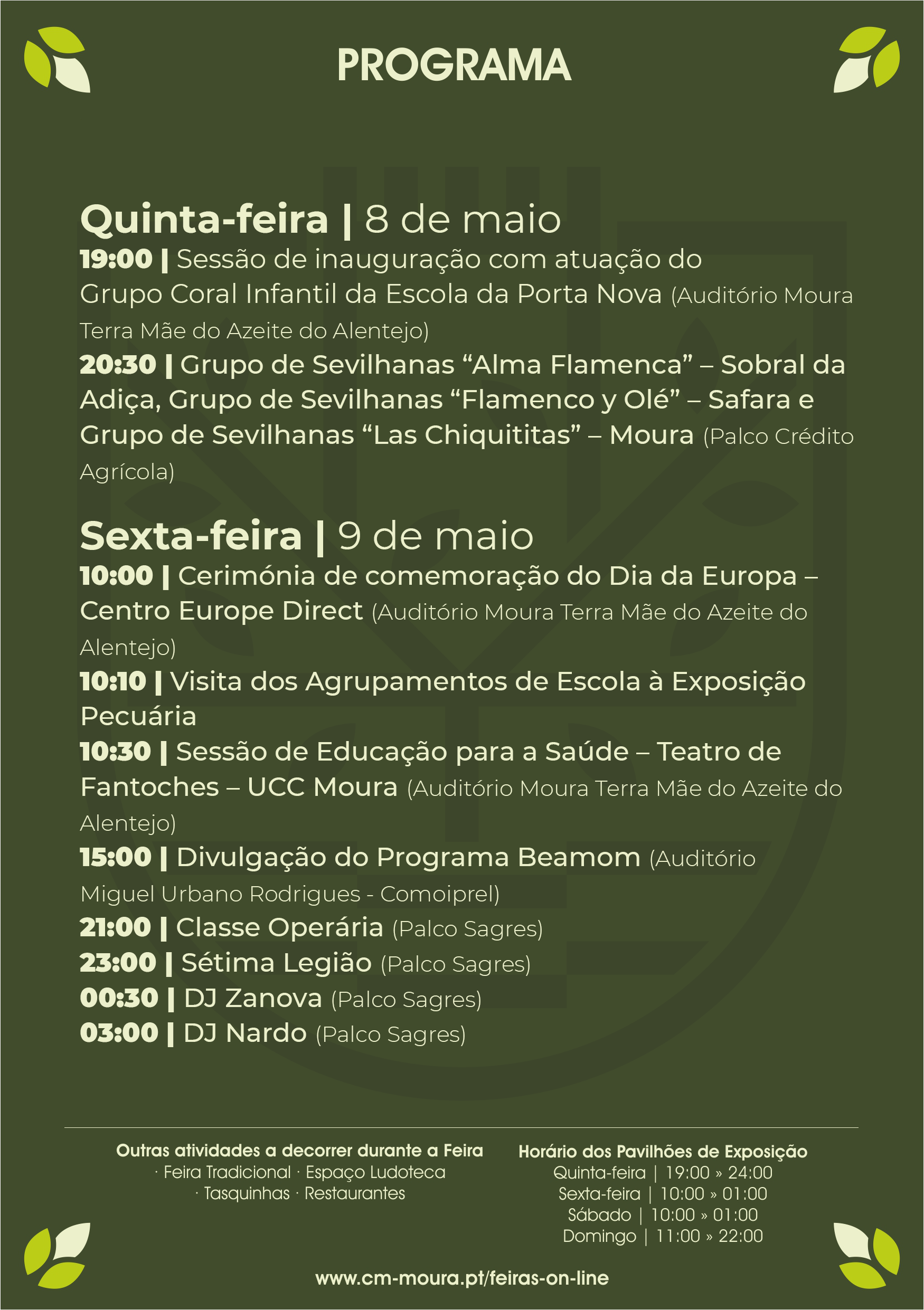 O programa completo pode ser consultado no site da Câmara Municipal de Moura, em www.cm-moura.pt, no separador ‘Feiras on-line’.