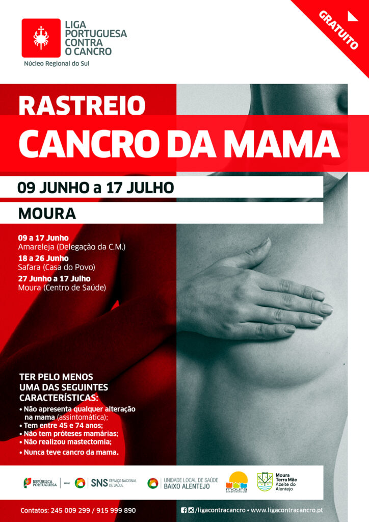 A Liga Portuguesa Contra o Cancro – Núcleo Regional do Sul (LPCC-NRS), em parceria com o Serviço Nacional de Saúde (SNS), a Câmara Municipal de Moura e as Juntas de Freguesia, volta a realizar este ano o Rastreio do Cancro de Mama, no concelho de Moura.