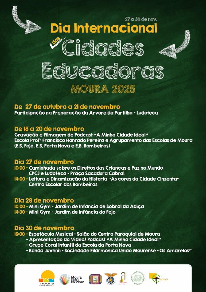 Todos os anos o Dia das Cidades Educadoras tem uma temática diferente, sendo a deste ano “A Participação das Crianças na Cidade Educadora”. Neste sentido, as atividades em 2025 foram direcionadas, sobretudo, para as crianças. De 27 de outubro a 21 de novembro, os alunos dos jardins de infância e 1.º Ciclo do concelho foram recebidos na Ludoteca para participarem na elaboração dos enfeites da Árvore da Partilha. Entre os dias 18 e 20 de novembro, os alunos de 4.º ano do Agrupamento de Escolas de Moura e do Agrupamento de Escolas Professor Francisco Honrado Pereira participaram na realização de um vídeo, onde se pretendeu saber qual seria a cidade ideal para estes jovens. Já esta quinta-feira, dia 27 de novembro, às 10:00, haverá uma Caminhada sobre os Direitos das Crianças e pela Paz no Mundo, na Praça Sacadura Cabral; e, às 14:00, no Centro Escolar dos Bombeiros, será dinamizada a história “As cores da Cidade Cinzenta”. No dia 28 de novembro, o projeto MiniGym irá até aos jardins de infância de Sobral da Adiça e do Fojo. As comemorações terminam no domingo, 30 de novembro, dia em que se comemora o Dia Internacional das Cidades Educadoras. A partir das 16:00, no Salão do Centro Paroquial de Moura, será visionado o vídeo sobre “A Minha Cidade Ideal”, seguindo-se um espetáculo musical com a atuação do Grupo Coral Infantil da Escola da Porta Nova e a Banda Juvenil da SFUM Os Amarelos.