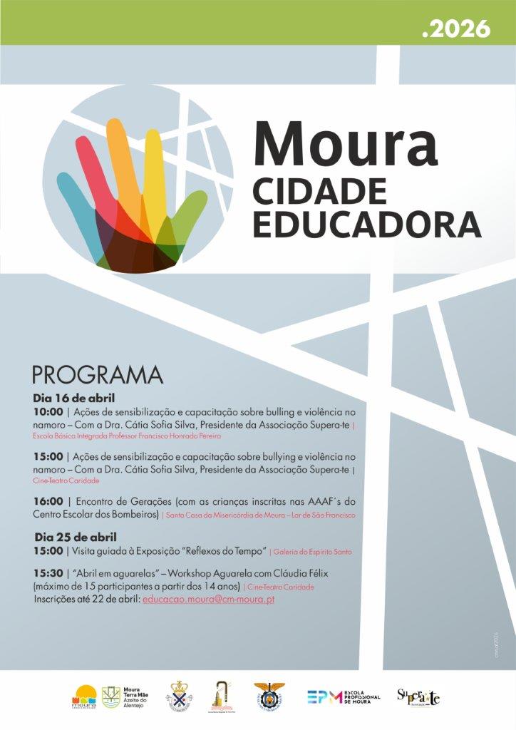 Já no dia 25 de abril, às 15:00, haverá uma visita guiada à exposição “Reflexos do Tempo”, na Galeria do Espírito Santo. E, às 15:30, no Cine-Teatro Caridade, tem lugar o workshop “Abril em Aguarelas”, com Cláudia Félix. Esta atividade tem um limite máximo de 15 participantes, com idades a partir dos 14 anos. Os interessados devem realizar a sua inscrição até 22 de abril para o email educacao.moura@cm-moura.pt